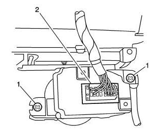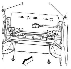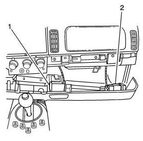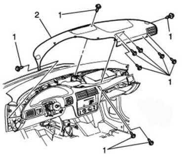 13. Remove the screws (1) attaching the I/P trim pad (2).